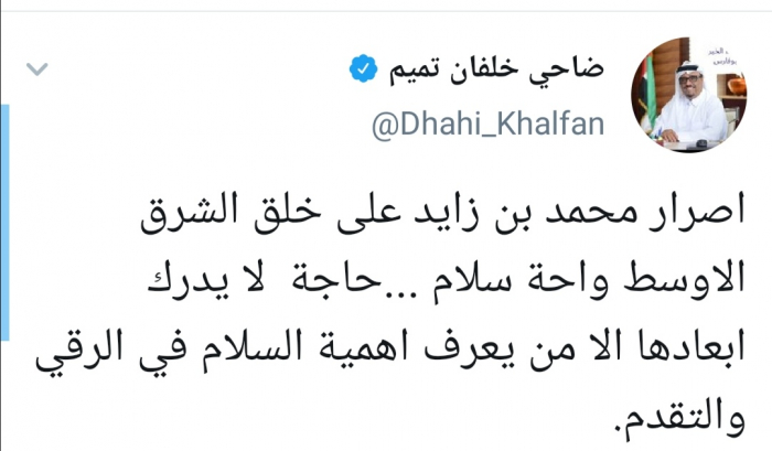 وقال خلفان في تغريدة له عبر حسابه بتويتر ورصدها "المشهد العربي": "إصرار محمد بن زايد على خلق الشرق الأوسط واحة سلام..حاجة لا يدرك أبعادها إلا من يعرف أهمية السلام في الرقي والتقدم".