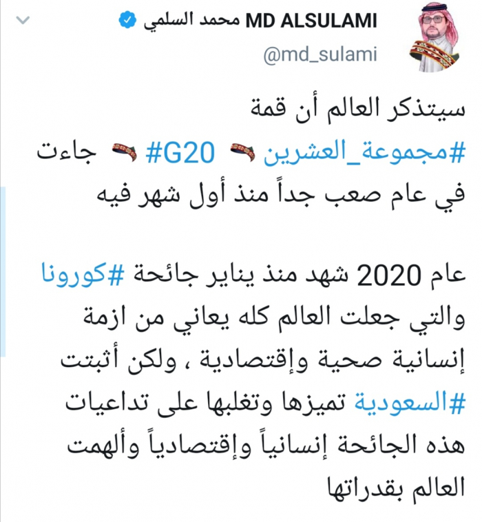 وقال السلمي عبر حسابه بتويتر ورصدها "المشهد العربي": "سيتذكر العالم أن قمة #مجموعة_العشرين #G20 جاءت في عام صعب جداً منذ أول شهر فيه".