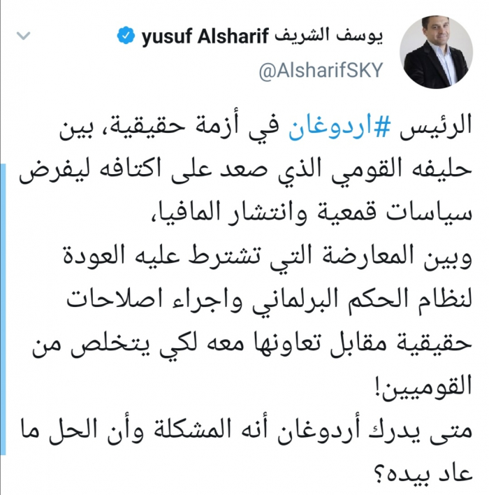 وقال الشريف في تغريدة له عبر حسابه بتويتر ورصدها "المشهد العربي" :"الرئيس أردوغان في أزمة حقيقية، بين حليفه القومي الذي صعد على أكتافه ليفرض سياسات قمعية وانتشار المافيا، وبين المعارضة التي تشترط عليه العودة لنظام الحكم البرلماني وإجراء إصلاحات حقيقية مقابل تعاونها معه لكي يتخلص من القوميين".