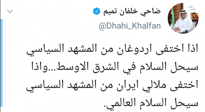وقال خلفان في تغريدة له عبر حسابه بتويتر ورصدها "المشهد العربي": "إذا اختفى أردوغان من المشهد السياسي سيحل السلام في الشرق الأوسط.. وإذا اختفى ملالي إيران من المشهد السياسي سيحل السلام العالمي".