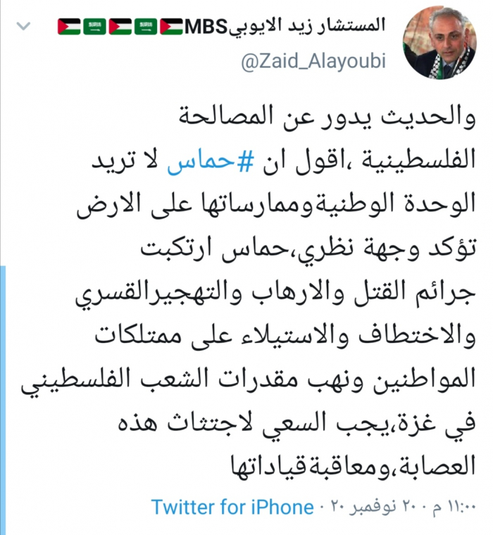 وأشار إلى أن "حماس ارتكبت جرائم القتل والإرهاب والتهجير القسري والاختطاف والاستيلاء على ممتلكات المواطنين ونهب مقدرات الشعب الفلسطيني في غزة"، مختتما تغريدته بقوله: "يجب السعي لاجتثاث هذه العصابة، ومعاقبة قياداتها".