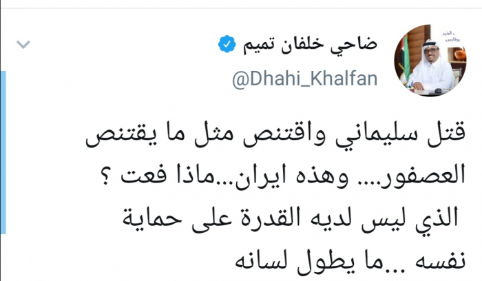 وقال خلفان في تغريدة له عبر حسابه بتويتر ورصدها "المشهد العربي": "قتل سليماني واقتنص مثل ما يقتنص العصفور.. وهذه إيران..ماذا فعت"؟