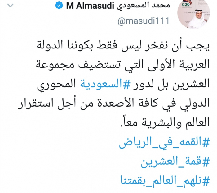 وقال المسعودي في تغريدة له عبر حسابه بتويتر ورصدها المشهد العربي: "يجب أن نفخر ليس فقط بكوننا الدولة العربية الأولى التي تستضيف مجموعة العشرين بل لدور السعودية المحوري الدولي في كافة الأصعدة من أجل استقرار العالم والبشرية معاً".