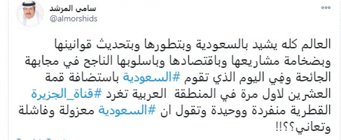 وقال في تغريدة عبر "تويتر" رصدها "المشهد العربي": "العالم كله يشيد بالسعودية وبتطورها وبتحديث قوانينها وبضخامة مشاريعها وباقتصادها وبأسلوبها الناجح في مجابهة الجائحة وفِي اليوم الذي تقوم السعودية باستضافة قمة العشرين لأول مرة في المنطقة العربية تغرد قناة الجزيرة القطرية منفردة ووحيدة وتقول أن السعودية معزولة وفاشلة وتعاني؟!".