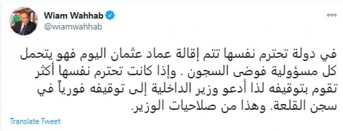 طالب السياسي اللبناني البارز وئام وهاب، اليوم، بضرورة توقيف المسؤولين عن أزمة فوضى السجون في لبنان.