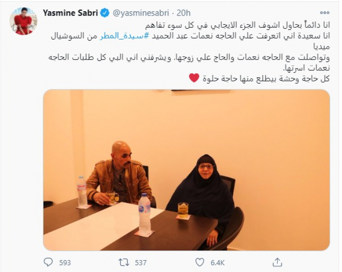 ونشرت ياسمين صبري، صورة لـ"الحاجة نعمات" وزوجها "الحاج علي"، وذلك عبر حسابها عبر موقع "تويتر"، وعلّقت: "أنا دائما بحاول أشوف الجزء الإيجابي في كل سوء تفاهم.. أنا سعيدة إني اتعرفت على الحاجة نعمات عبد الحميد سيدة المطر من السوشيال ميديا، وتواصلت مع الحاجة نعمات والحاج علي زوجها.. ويشرفني إني ألبي كل طلبات الحاجة نعمات وأسرتها.. كل حاجة وحشة بيطلع منها حاجة حلوة".