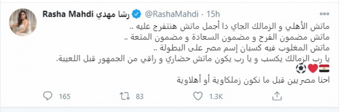 وكتبت رشا، عبر حسابها على تويتر، قائلة: "ماتش الأهلي والزمالك الجاي دا أجمل ماتش هنتفرج عليه.. ماتش مضمون الفرح ومضمون السعادة ومضمون المتعة.. ماتش المغلوب فيه كسبان اسم مصر على البطولة".