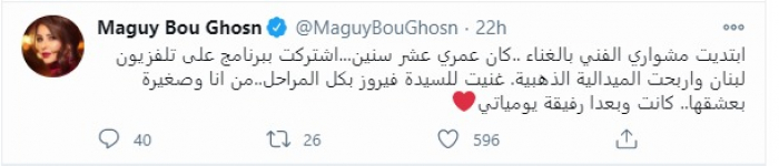 وكتبت ماجي، عبر حسابها على تويتر، قائلة : "ابتديت مشواري الفني بالغناء ..كان عمري عشر سنين..اشتركت ببرنامج على تلفزيون لبنان وربحت الميدالية الذهبية.. غنيت للسيدة فيروز بكل المراحل..من أنا وصغيرة بعشقها.. كانت وبعدا رفيقة يومياتي".