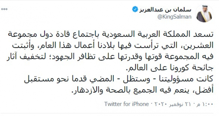 وجاء في نص تغريدة الملك سلمان: " تسعد المملكة العربية السعودية باجتماع قادة دول مجموعة العشرين، التي ترأست فيها بلادنا أعمال هذا العام، وأثبتت فيه المجموعة قوتها وقدرتها على تظافر الجهود؛ لتخفيف آثار جائحة كورونا على العالم.