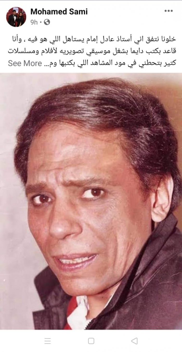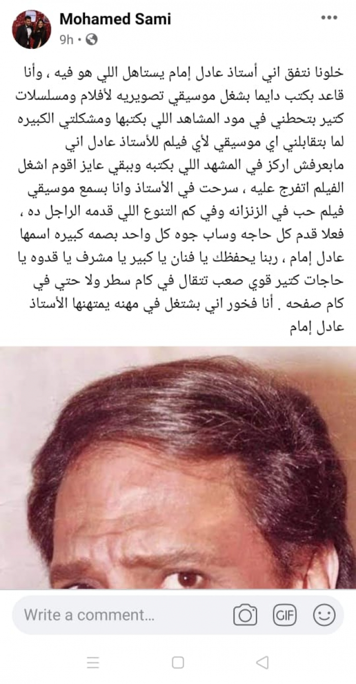 ونشر سامي، صورة عادل إمام، عبر حسابه على فيسبوك، وعلق : "خلونا نتفق إن أستاذ عادل إمام يستاهل اللي هو فيه، وأنا قاعد بكتب دايما بشغل موسيقي تصويرية لأفلام ومسلسلات كتير بتحطني في مود المشاهد اللي بكتبها، ومشكلتي الكبيرة لما بتقابلني أي موسيقي لأي فيلم للأستاذ عادل إني مابعرفش أركز في المشهد اللي بكتبه وببقى عايز أقوم اشغل الفيلم اتفرج عليه".