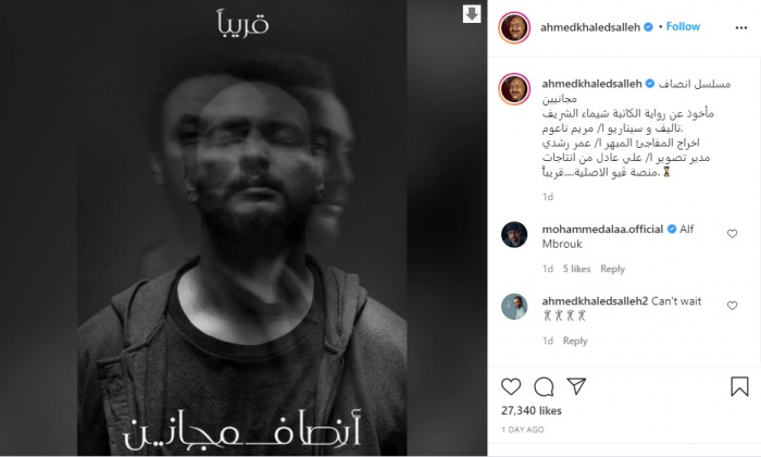ونشر أحمد خالد، صورة له على بوستر المسلسل، عبر حسابه على إنستجرام، وعلق:" مسلسل أنصاف مجانين.. مأخوذ عن رواية الكاتبة شيماء الشريف.. تأليف وسيناريو أ/ مريم ناعوم..إخراج المفاجئ المبهر أ/ عمر رشدي.. مدير تصوير أ/ علي عادل من إنتاجات منصة ڤيو الأصلية....قريباً".
