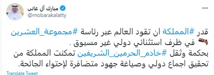 وقال في تغريدة عبر "تويتر" رصدها "المشهد العربي": "قدر المملكة أن تقود العالم عبر رئاسة مجموعة العشرين في ظرف استثنائي دولي غير مسبوق".