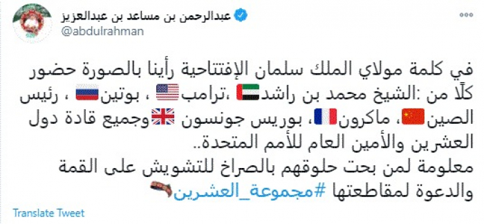 وقال في تغريدة عبر "تويتر" رصدها "المشهد العربي": "في كلمة مولاي الملك سلمان الإفتتاحية رأينا بالصورة حضور كلًا من :الشيخ محمد بن راشد،ترامب، بوتين، رئيس الصين، ماكرون، بوريس جونسونوجميع قادة دول العشرين والأمين العام للأمم المتحدة".