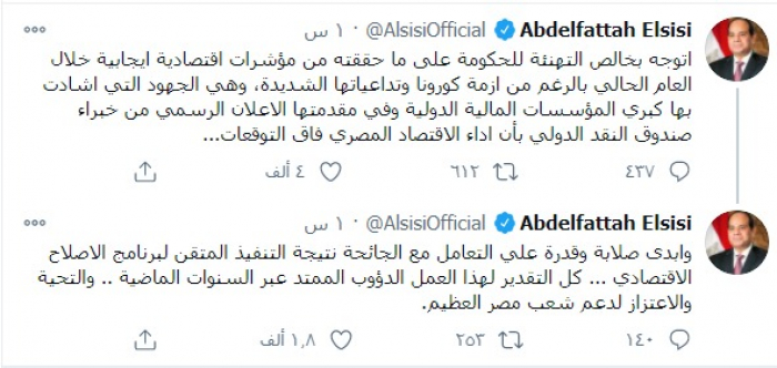 وكتب السيسي على "تويتر": "أتوجه بخالص التهنئة للحكومة على ما حققته من مؤشرات اقتصادية إيجابية خلال العام الحالي بالرغم من أزمة كورونا وتداعياتها الشديدة".