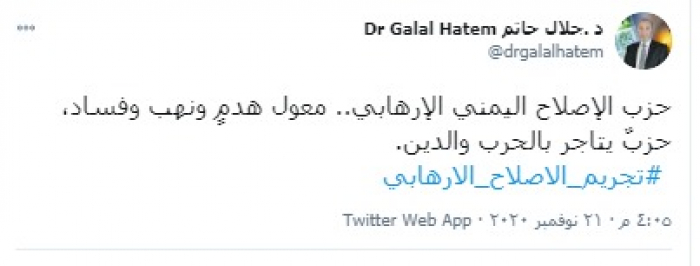 وكتب "حاتم" تغريدة عبر تويتر، رصدها "المشهد العربي": " حزب الإصلاح اليمني الإرهابي.. معول هدمٍ ونهب وفساد، حزبٌ يتاجر بالحرب والدين".