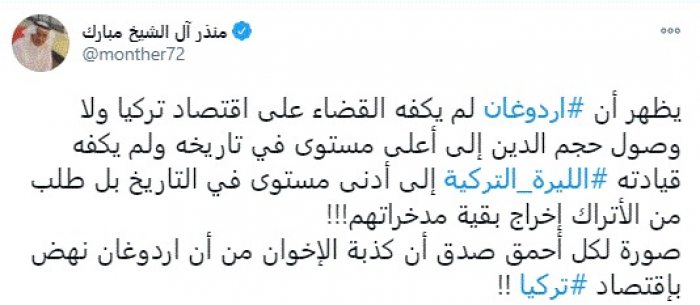وقال في تغريدة عبر "تويتر" رصدها "المشهد العربي": "يظهر أن أردوغان لم يكفه القضاء على اقتصاد تركيا ولا وصول حجم الدين إلى أعلى مستوى في تاريخه ولم يكفه قيادته الليرة التركية إلى أدنى مستوى في التاريخ بل طلب من الأتراك إخراج بقية مدخراتهم".