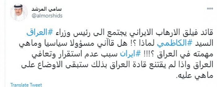 وقال في تغريدة عبر "تويتر" رصدها "المشهد العربي": "قائد فيلق الإرهاب الإيراني يجتمع إلى رئيس وزراء العراق السيد الكاظمي لماذا ؟! هل قاآني مسؤولا سياسيا وماهي مهمته في العراق؟".