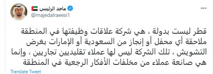 وقال في تغريدة عبر "تويتر" رصدها "المشهد العربي": "قطر ليست بدولة ، هي شركة علاقات وظيفتها في المنطقة ملاحقة أي محفل أو إنجاز من السعودية أو الإمارات بغرض التشويش ، تلك الشركة ليس لها عملاء تقليديين تجاريين ، وإنما هي صانعة عملاء من مخلفات الأفكار الرجعية في المنطقة".