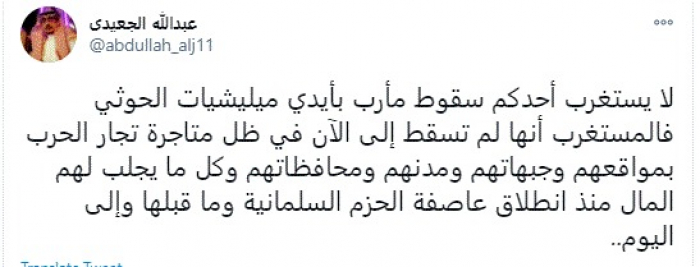 وقال في تغريدة عبر "تويتر" رصدها "المشهد العربي": "لا يستغرب أحدكم سقوط مأرب بأيدي مليشيات الحوثي فالمستغرب أنها لم تسقط إلى الآن في ظل متاجرة تجار الحرب بمواقعهم وجبهاتهم ومدنهم ومحافظاتهم وكل ما يجلب لهم المال منذ انطلاق عاصفة الحزم السلمانية وما قبلها وإلى اليوم".