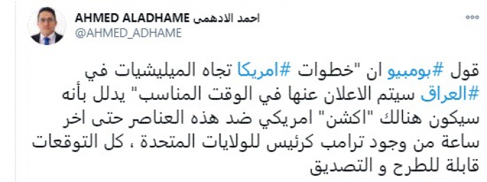 وكتب في تغريدة عبر "تويتر" رصدها "المشهد العربي": "قول بومبيو أن خطوات أمريكا تجاه الميليشيات في العراق سيتم الإعلان عنها في الوقت المناسب يدلل بأنه سيكون هنالك أكشن أمريكي ضد هذه العناصر حتى آخر ساعة من وجود ترامب كرئيس للولايات المتحدة ، كل التوقعات قابلة للطرح و التصديق".