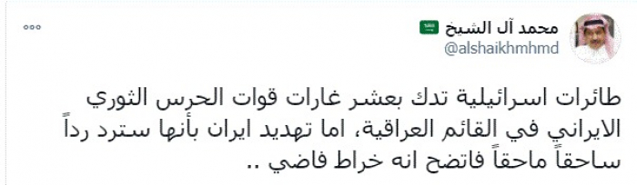 سخر الكاتب السعودي محمد آل الشيخ، اليوم، من النظام الإيراني، بعد الغارات الإسرائيلية على مواقع للحرس الثوري في سوريا.
