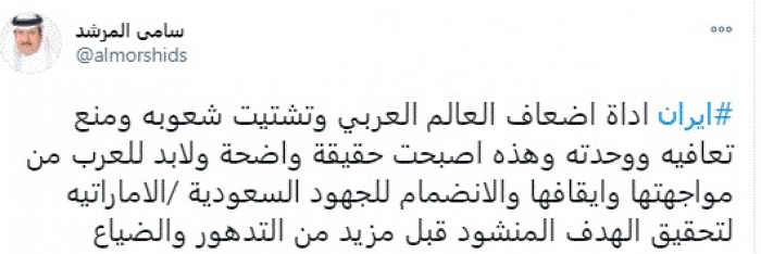 وقال في تغريدة عبر "تويتر" رصدها "المشهد العربي": "إيران أداة إضعاف العالم العربي وتشتيت شعوبه ومنع تعافيه ووحدته وهذه أصبحت حقيقة واضحة ولا بد للعرب من مواجهتها وإيقافها والانضمام للجهود السعودية /الاماراتيه لتحقيق الهدف المنشود قبل مزيد من التدهور والضياع".