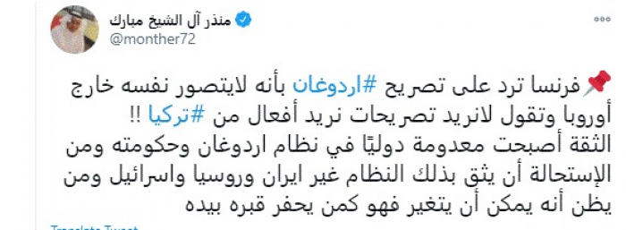 وكتب في تغريدة عبر "تويتر" رصدها "المشهد العربي": "فرنسا ترد على تصريح أردوغان بأنه لا يتصور نفسه خارج أوروبا وتقول لا نريد تصريحات نريد أفعال من تركيا".