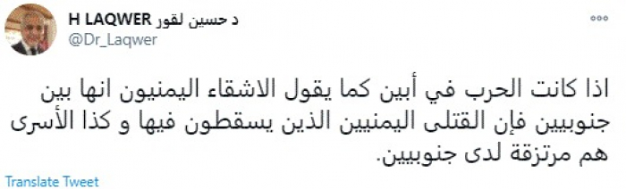وقال في تغريدة عبر "تويتر" رصدها "المشهد العربي": "إذا كانت الحرب في أبين كما يقول الأشقاء اليمنيون إنها بين جنوبيين فإن القتلى اليمنيين الذين يسقطون فيها و كذا الأسرى هم مرتزقة لدى جنوبيين".