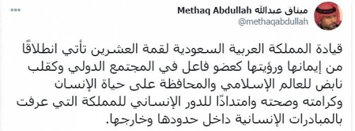 وقال في تغريدة عبر "تويتر" رصدها "المشهد العربي": "قيادة المملكة العربية السعودية لقمة العشرين تأتي انطلاقًا من إيمانها ورؤيتها كعضو فاعل في المجتمع الدولي وكقلب نابض للعالم الإسلامي والمحافظة على حياة الإنسان وكرامته وصحته وامتدادًا للدور الإنساني للمملكة التي عرفت بالمبادرات الإنسانية داخل حدودها وخارجها".