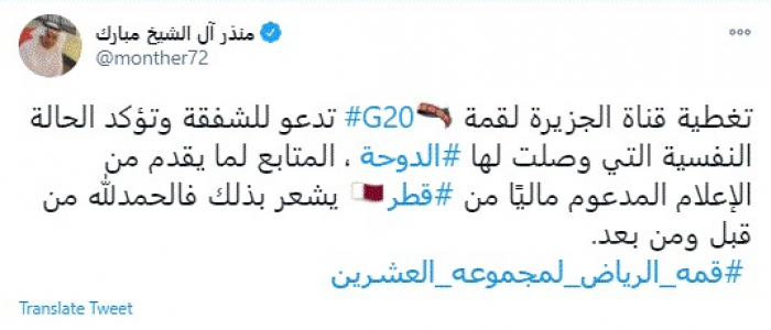 وكتب في تغريدة عبر "تويتر" رصدها "المشهد العربي": "تغطية قناة الجزيرة لقمة G20 تدعو للشفقة وتؤكد الحالة النفسية التي وصلت لها الدوحة ، المتابع لما يقدم من الإعلام المدعوم ماليًا من قطر يشعر بذلك فالحمدلله من قبل ومن بعد".