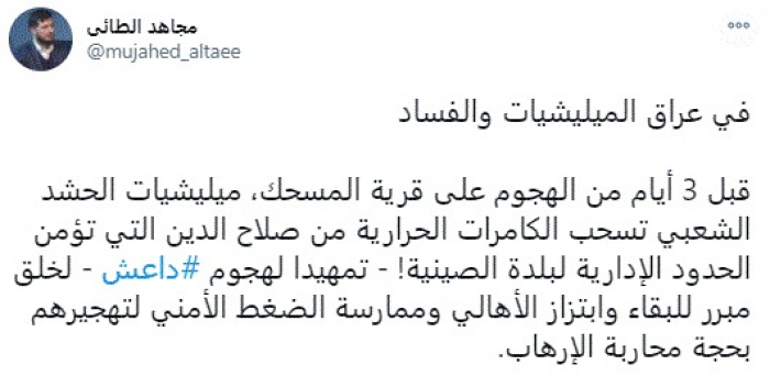 وقال في تغريدة عبر "تويتر" رصدها "المشهد العربي": "في عراق المليشيات والفساد.. قبل 3 أيام من الهجوم على قرية المسحك، ميليشيات الحشد الشعبي تسحب الكامرات الحرارية من صلاح الدين التي تؤمن الحدود الإدارية لبلدة الصينية تمهيدا لهجوم داعش - لخلق مبرر للبقاء وابتزاز الأهالي وممارسة الضغط الأمني لتهجيرهم بحجة محاربة الإرهاب".
