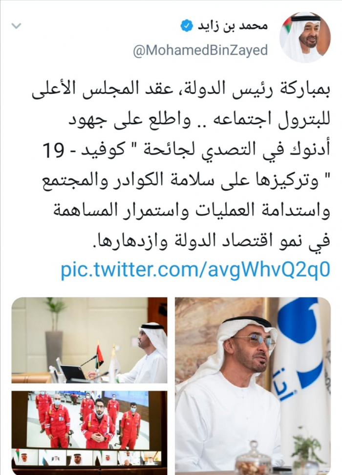 وكتب بن زايد في تغريدة عبر "تويتر" رصدها "المشهد العربي": "بمباركة رئيس الدولة، عقد المجلس الأعلى للبترول اجتماعه .. واطلع على جهود أدنوك في التصدي لجائحة " كوفيد - 19 " وتركيزها على سلامة الكوادر والمجتمع واستدامة العمليات واستمرار المساهمة في نمو اقتصاد الدولة وازدهارها".