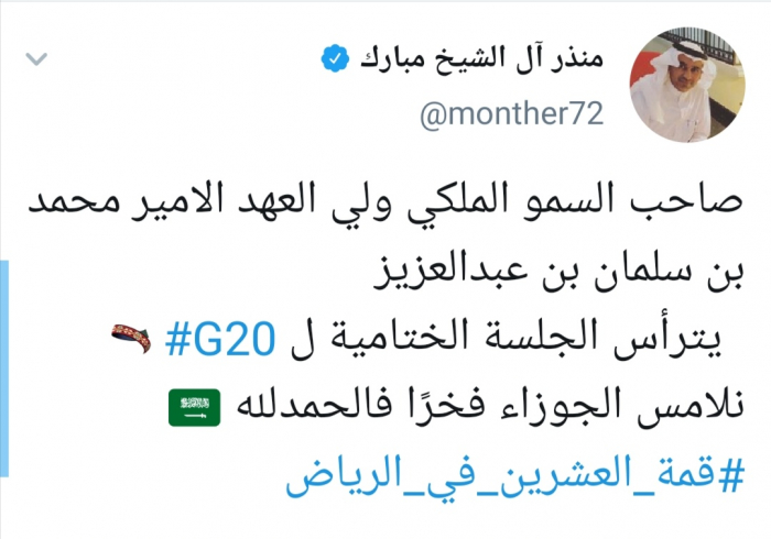 أشاد المدون السعودي منذر آل شيخ المبارك، بترأس ولي العهد السعودي الأمير محمد بن سلمان لختام قمة العشرين.