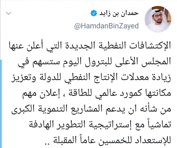 وقال الشيخ حمدان في تغريدة له عبر حسابه بتويتر ورصدها المشهد العربي: "الاكتشافات النفطية الجديدة التي أعلن عنها المجلس الأعلى للبترول اليوم ستسهم في زيادة معدلات الإنتاج النفطي للدولة وتعزيز مكانتها كمورد عالمي للطاقة".