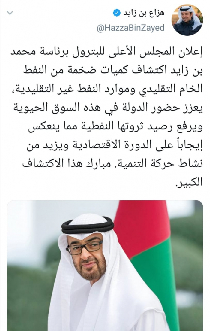 وقال بن زايد في تغريدة له عبر حسابه بتويتر ورصدها المشهد العربي: "إعلان المجلس الأعلى للبترول برئاسة محمد بن زايد اكتشاف كميات ضخمة من النفط الخام التقليدي وموارد النفط غير التقليدية".