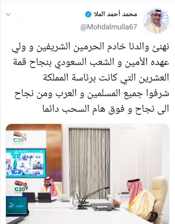 وكتب الملا في تغريدة له عبر حسابه بتويتر ورصدها "المشهد العربي": "نهنئ والدنا خادم الحرمين الشريفين وولي عهده الأمين و الشعب السعودي بنجاح قمة العشرين التي كانت برئاسة المملكة".