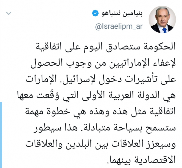 وأضاف نتنياهو في تغريدة له عبر حسابه بتويتر ورصدها المشهد العربي، أن "الإمارات هي الدولة العربية الأولى التي وُقّعت معها اتفاقية مثل هذه وهذه هي خطوة مهمة ستسمح بسياحة متبادلة".