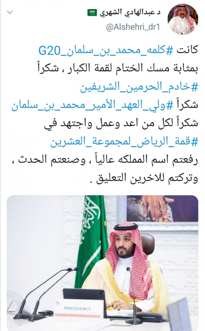 ووجه الشهري الشكر "لخادم الحرمين الشريفين، وولي العهد الأمير محمد بن سلمان، وكل من أعد وعمل واجتهد في قمة الرياض لمجموعة العشرين".