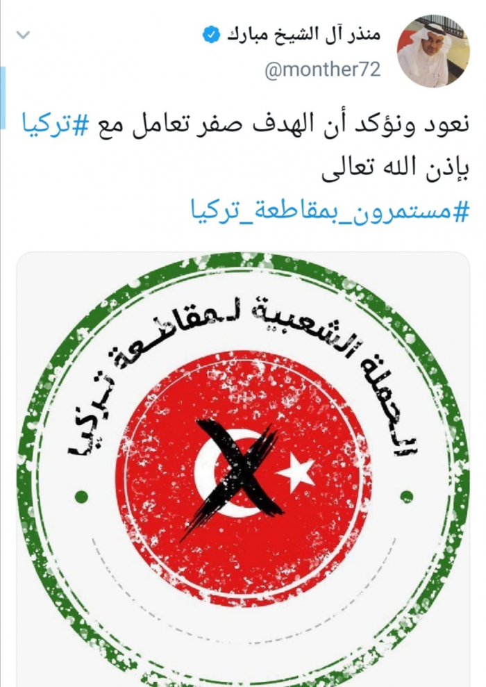 وقال آل شيخ المبارك عبر تغريدة له على "تويتر" رصدها " المشهد العربي" : "نعود ونؤكد أن الهدف صفر تعامل مع تركيا بإذن الله تعالى"، مدشنا هاشتاج #مستمرون_بمقاطعة_تركيا".