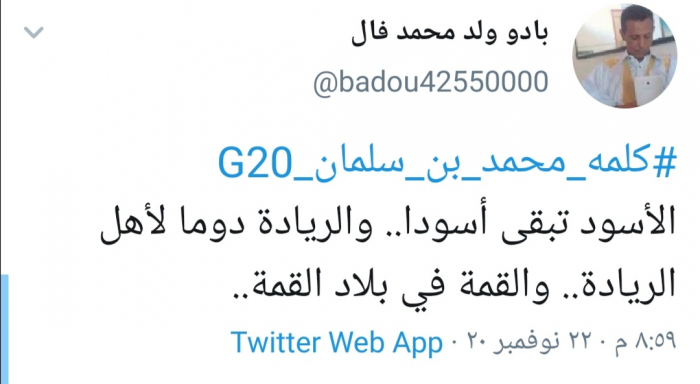 أشاد الكاتب الصحفي الموريتاني بادو ولد محمد فال، بكلمة ولي العهد السعودي الأمير محمد بن سلمان في قمة العشرين.