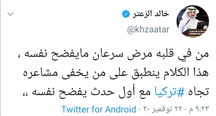 وقال الزعتر عبر تغريدة له على "تويتر" رصدها "المشهد العربي" :"من في قلبه مرض سرعان مايفضح نفسه، هذا الكلام ينطبق على من يخفى مشاعره تجاه تركيا مع أول حدث يفضح نفسه".
