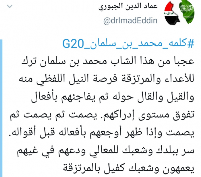 وقال الجبوري في تغريدة له عبر حسابه بتويتر ورصدها المشهد العربي عن كلمة محمد بن سلمان في G20 "عجبا من هذا الشاب محمد بن سلمان ترك للأعداء والمرتزقة فرصة النيل اللفظي منه والقيل والقال حوله ثم يفاجئهم بأفعال تفوق مستوى إدراكهم".