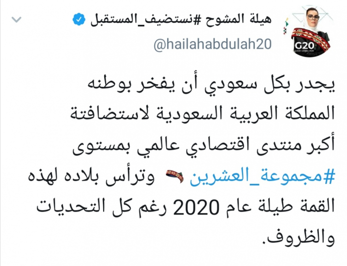 وكتبت المشوح عبر حسابها بتويتر رصدها " المشهد العربي":"يجدر بكل سعودي أن يفخر بوطنه المملكة العربية السعودية لاستضافتة أكبر منتدى اقتصادي عالمي بمستوى #مجموعة_العشرين وترأس بلاده لهذه القمة طيلة عام 2020 رغم كل التحديات والظروف".