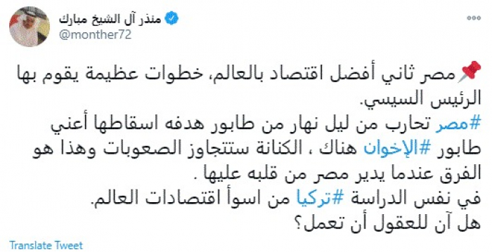 وقال في تغريدة عبر "تويتر" رصدها "المشهد العربي": "مصر ثاني أفضل اقتصاد بالعالم، خطوات عظيمة يقوم بها الرئيس السيسي. مصر تحارب من ليل نهار من طابور هدفه إسقاطها أعني طابور الإخوان هناك ، الكنانة ستتجاوز الصعوبات وهذا هو الفرق عندما يدير مصر من قلبه عليها".