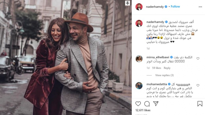 ونشر نادر صورة لعطية وخطيبته، عبر حسابه الرسمي بموقع "إنستجرام"، وعلق: "ألف مبروك لصديق عمري محمد عطية فرحانلك أوي إنك فرحان ويارب دايما مبسوط ، أما ميرنا بقى مش عارف أجيبها لك إزاي!! ربنا يكون في عونك شدة وتزول، مبروك يا حبايبي".
