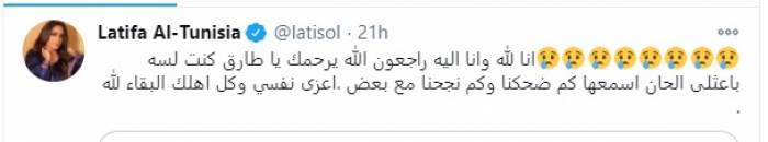 وغردت "لطيفة"، عبر "تويتر"، قائلة: "إنا لله وإنا إليه راجعون. الله يرحمك يا طارق كنت لسه باعت لي ألحان أسمعها كم ضحكنا وكم نجحنا مع بعض، أعزي نفسي وكل أهلك البقاء لله".
