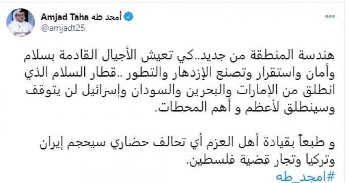 وقال في تغريدة عبر "تويتر" رصدها "المشهد العربي": "هندسة المنطقة من جديد..كي تعيش الأجيال القادمة بسلام وأمان واستقرار وتصنع الإزدهار والتطور ..قطار السلام الذي انطلق من الإمارات والبحرين والسودان وإسرائيل لن يتوقف وسينطلق لأعظم وأهم المحطات".