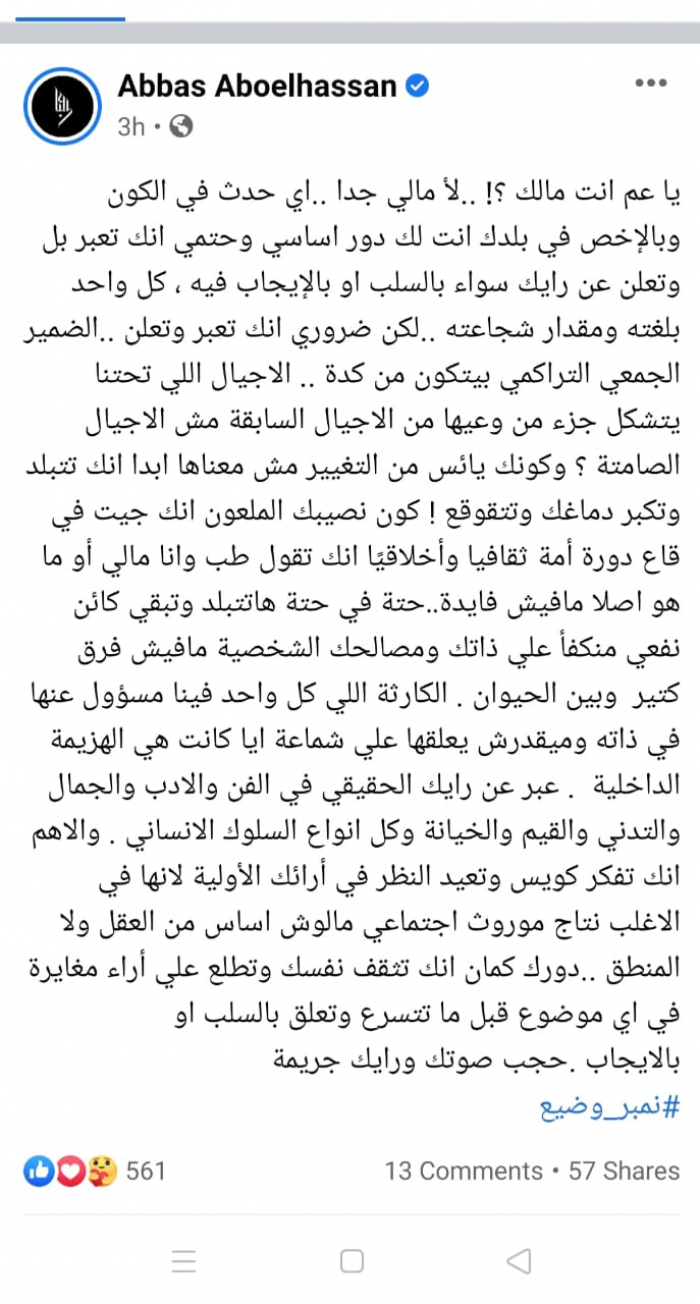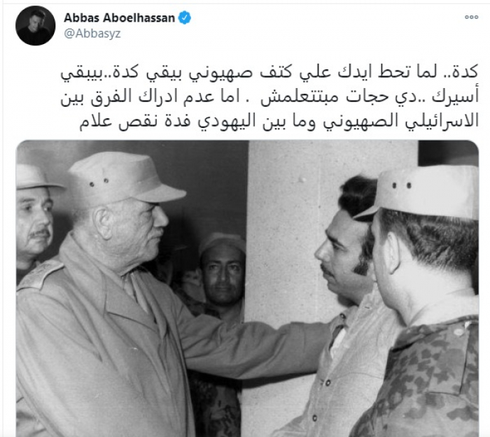 وعبر حسابه بـ"تويتر"، نشر أبو الحسن صورة المشير أحمد إسماعيل علي مع الأسير الإسرائيلي عساف ياجوري الذي أسرته قواتنا الباسلة في سيناء، وعلق عليها قائلًا: "كده.. لما تحط إيدك على كتف صهيوني بيبقى كده.. بيبقى أسيرك.. دي حاجات مبتتعلمش.. أما عدم إدراك الفرق بين الإسرائيلي الصهيوني وما بين اليهودي فده نقص علام".