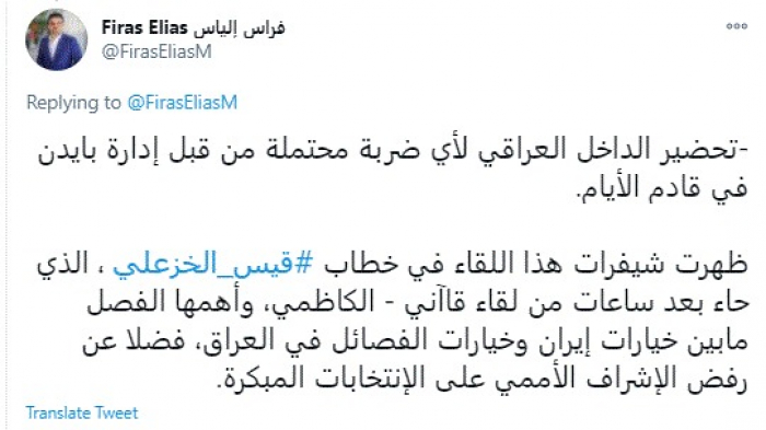 وقال في تغريدة عبر "تويتر" رصدها "المشهد العربي": "تحضير الداخل العراقي لأي ضربة محتملة من قبل إدارة بايدن في قادم الأيام".