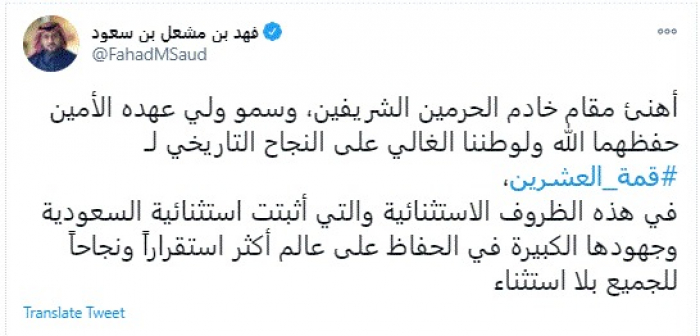 قال الأمير السعودي البارز فهد بن مشعل بن مسعود، اليوم، إن السعودية بذلت جهودًا كبيرة لإنجاح قمة العشرين والحفاظ على عالم أكثر استقرارًا ونجاحًا.